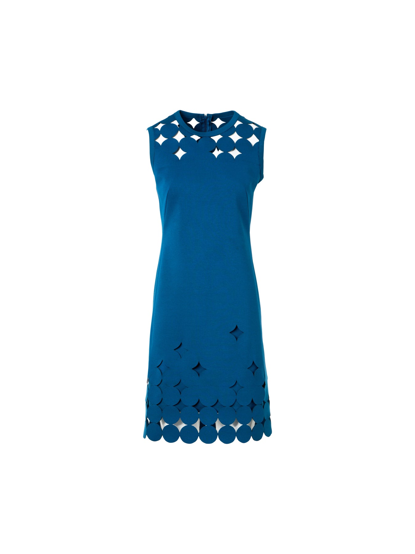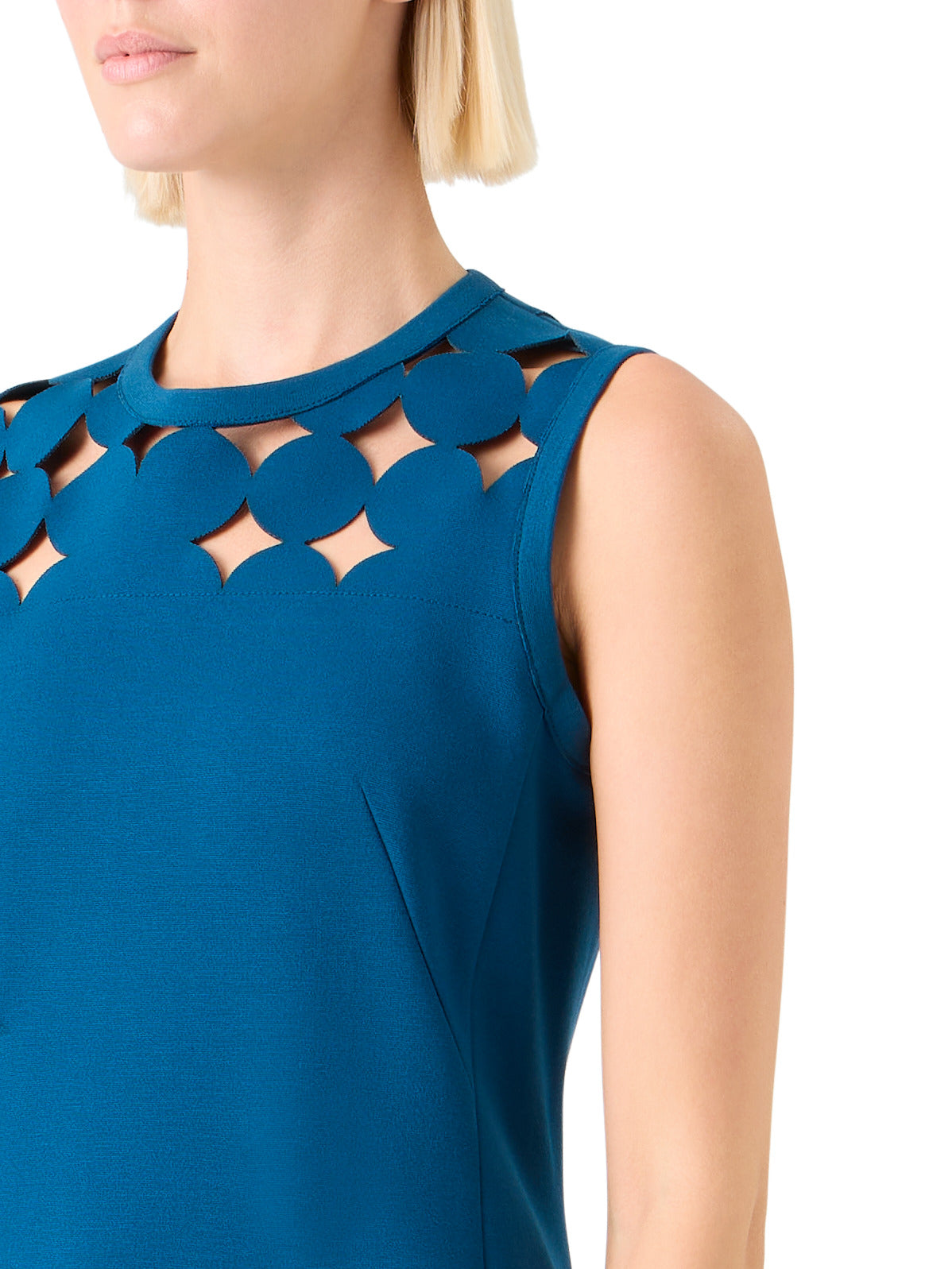 Sleeveless dress by Akris Punto with a diamond and dot cut out detail on the chest and hemline.  The dress also includes a round neckline, invisible back zipper close with signature ring pull.
