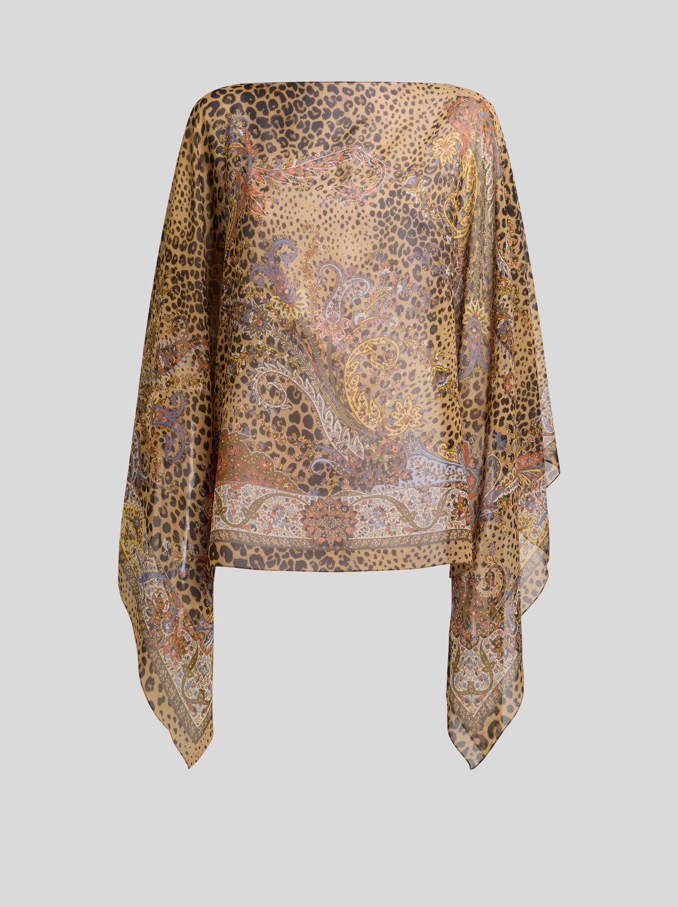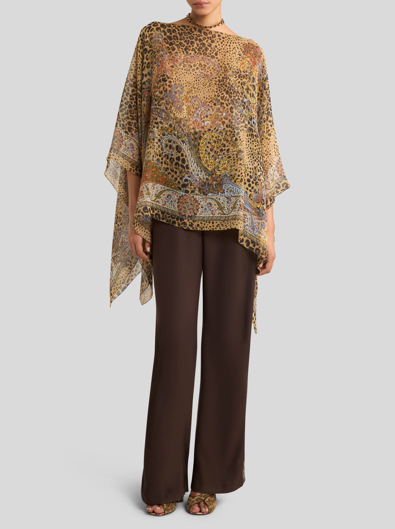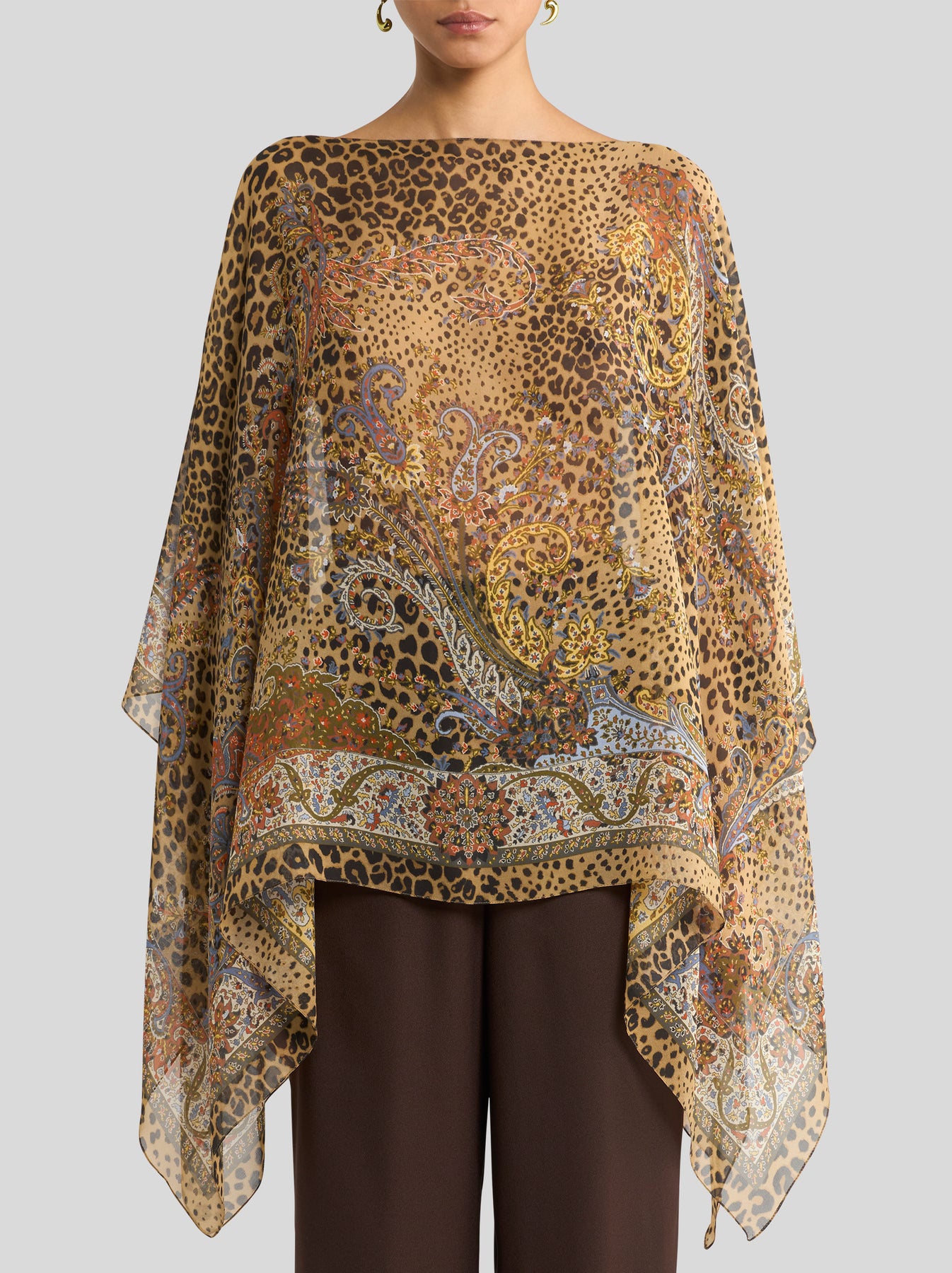 Flowing, silk poncho style top by ETRO with a wide boat neckline and an asymmetrical hemline.