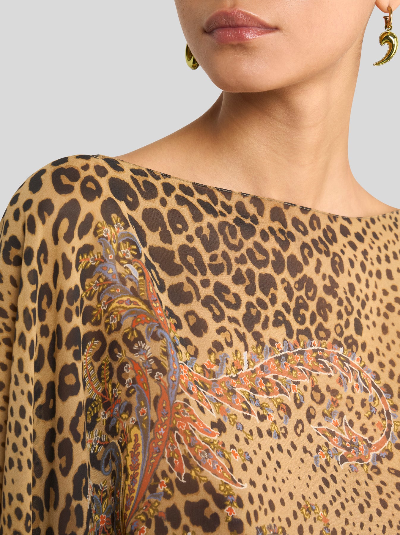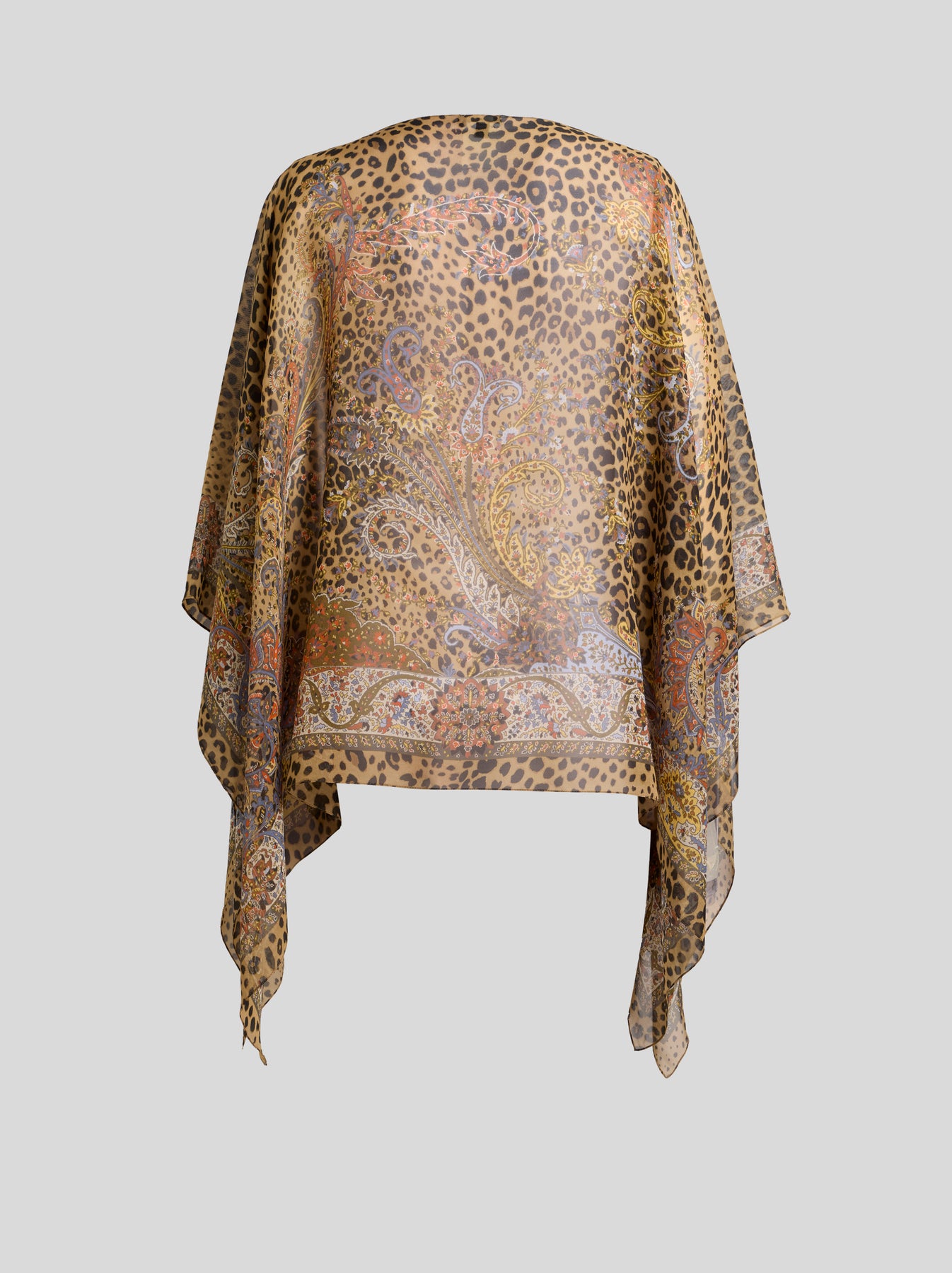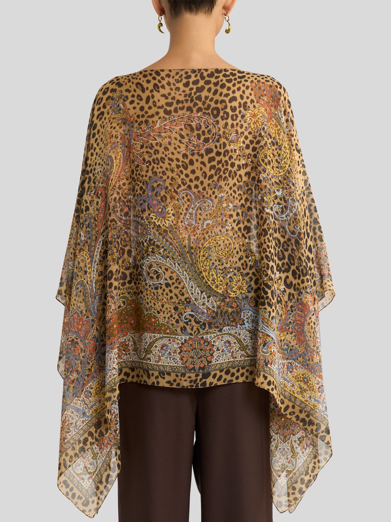 Flowing, silk poncho style top by ETRO with a wide boat neckline and an asymmetrical hemline.