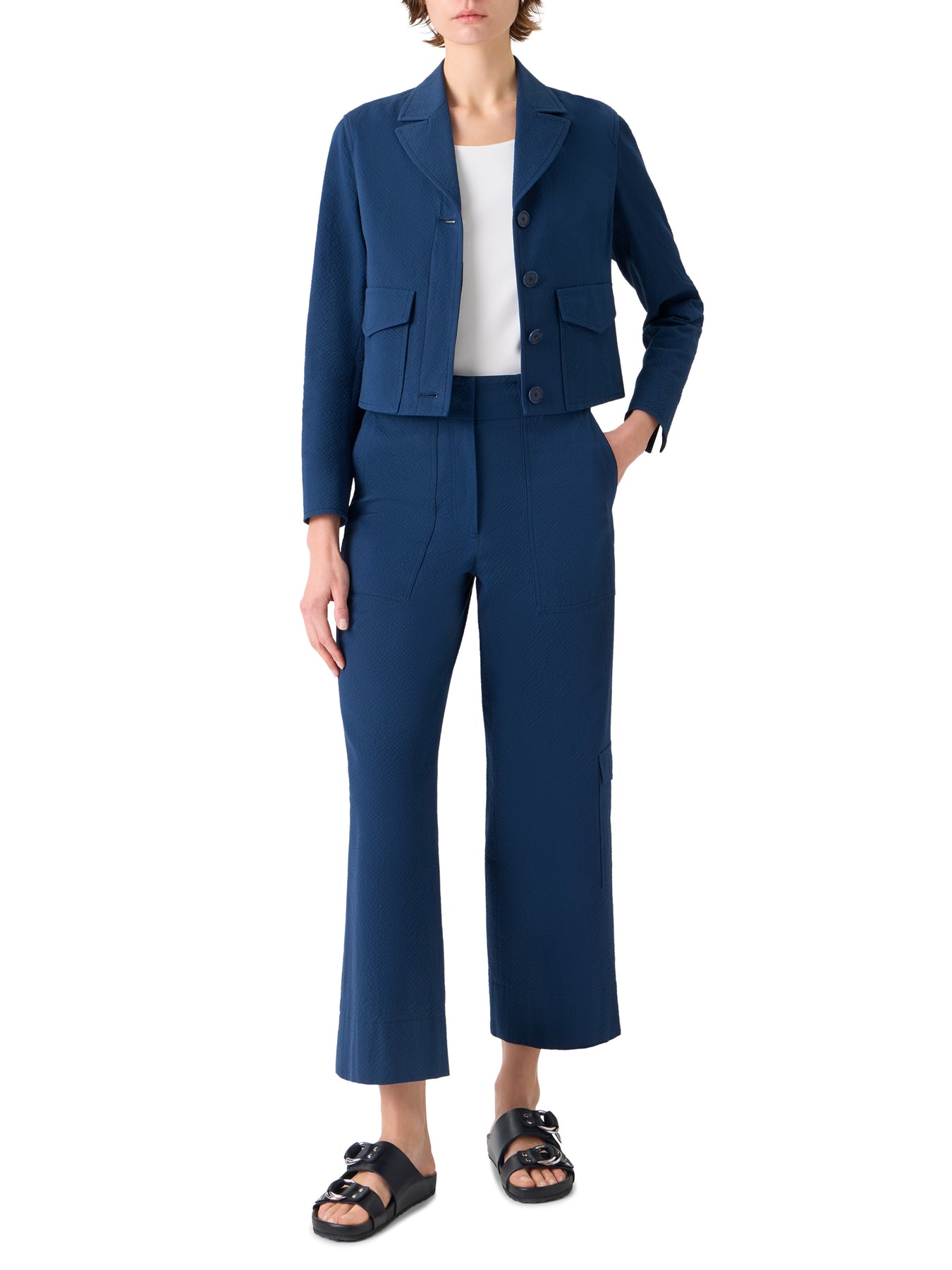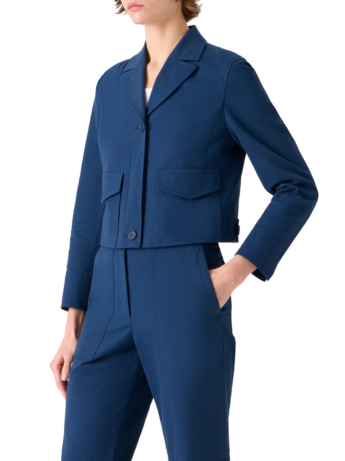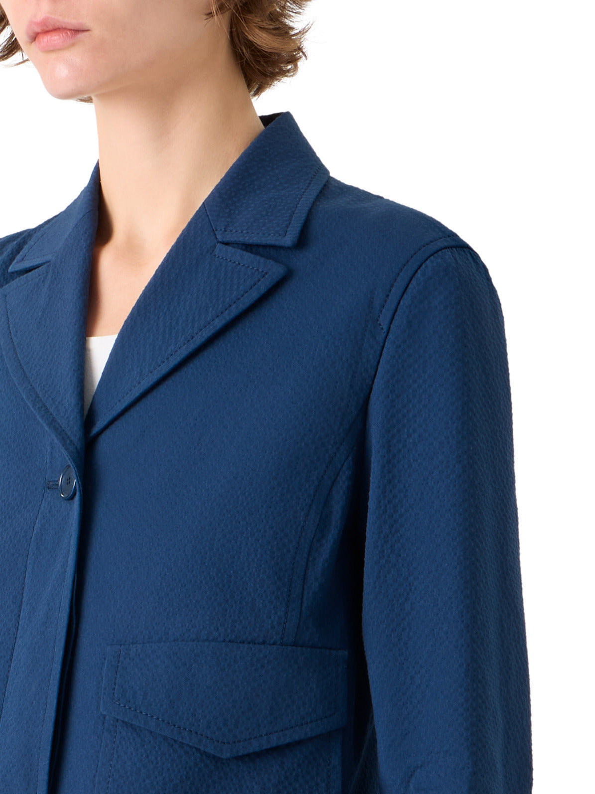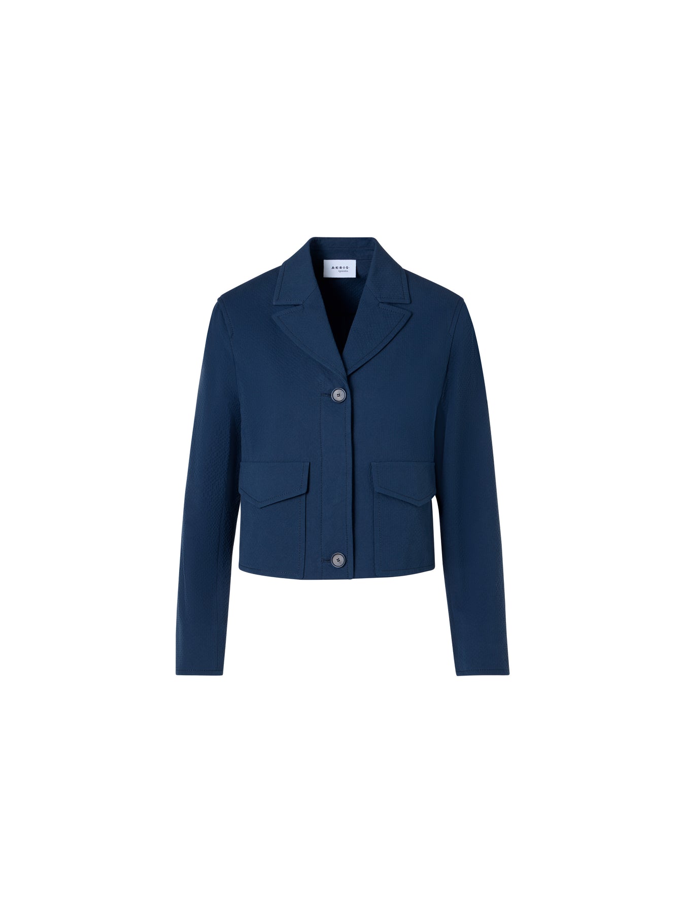 Cotton, stretch, seersucker jacket by Akris Punto with oversized front patch pockets.