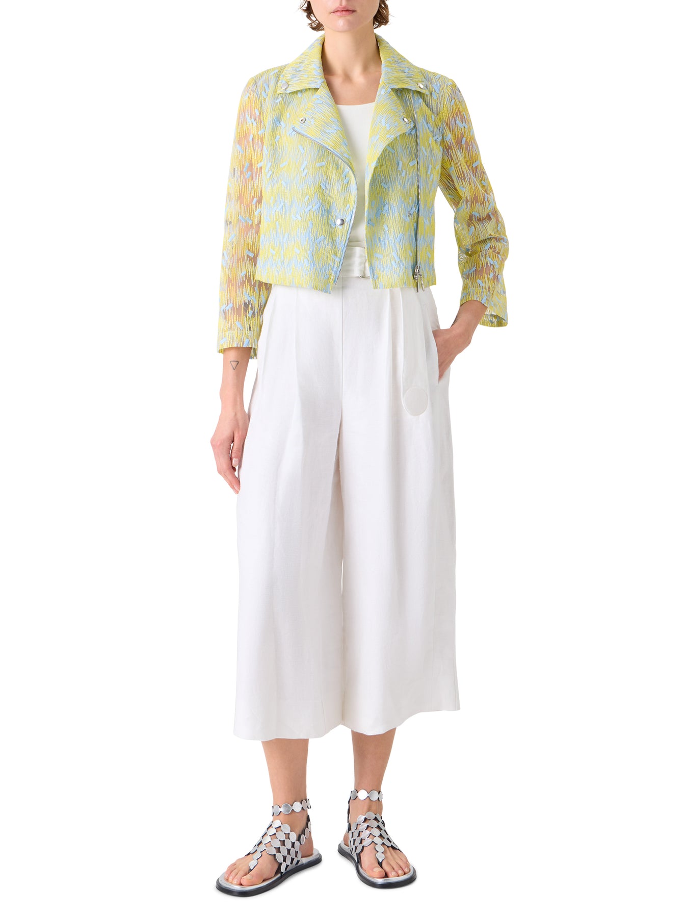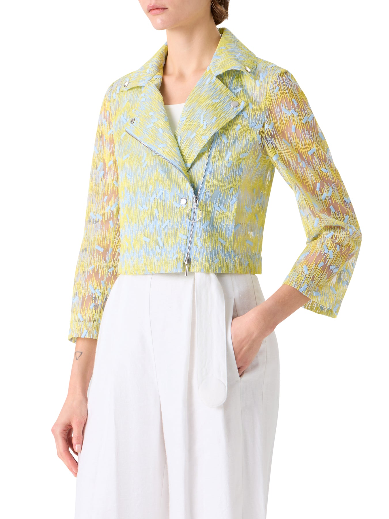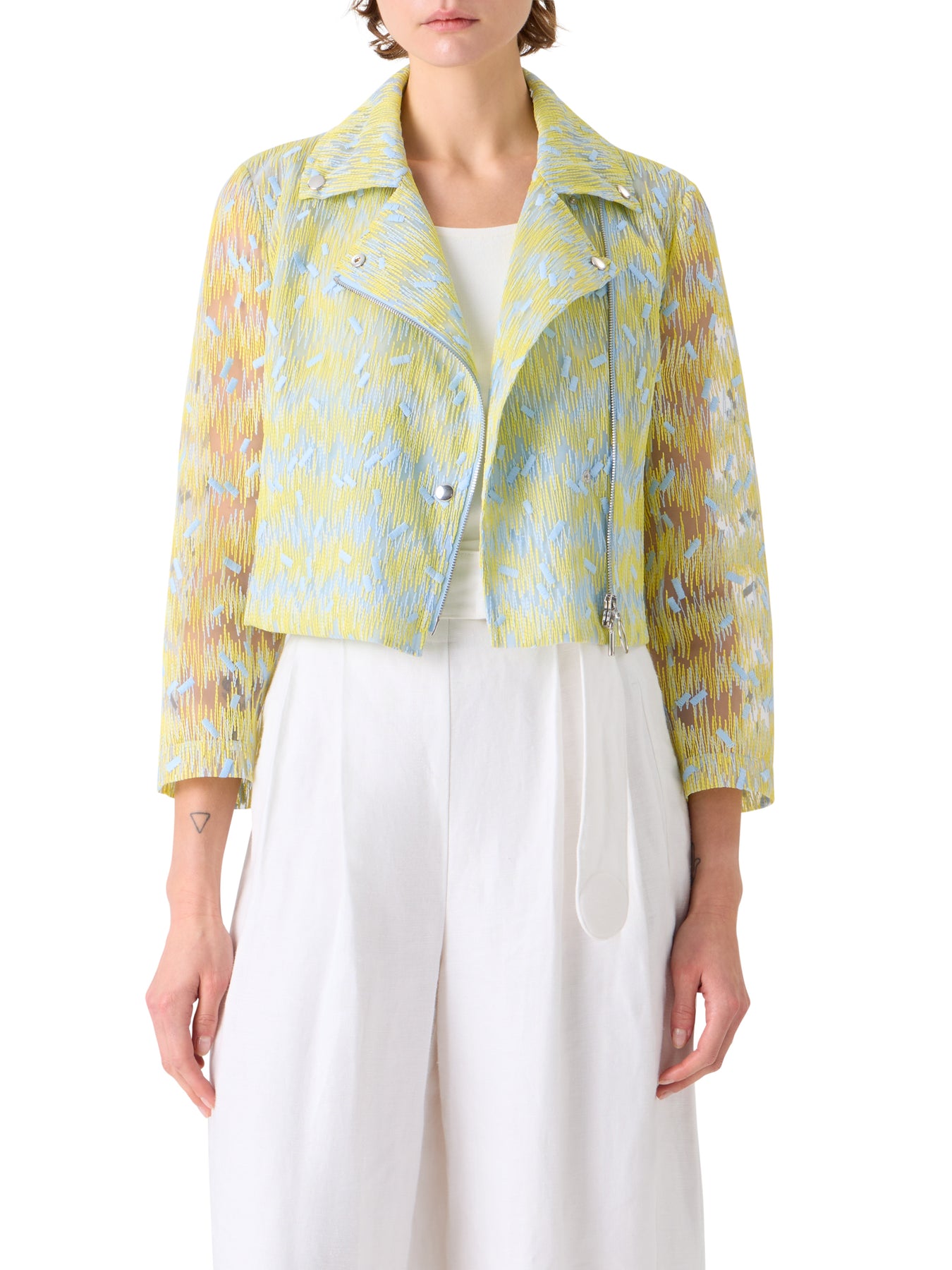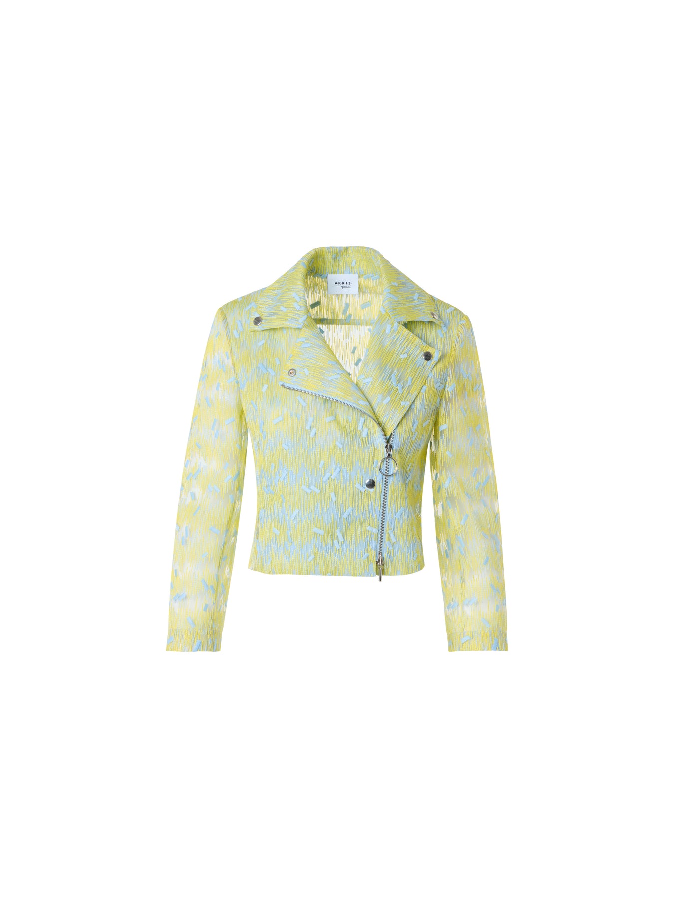 Sheer, tulle biker style jacket by Akris Punto with an all-over, subtle scribble pattern.  The jacket is completed with a distinctive O-ring zipper pull and metallic snaps.