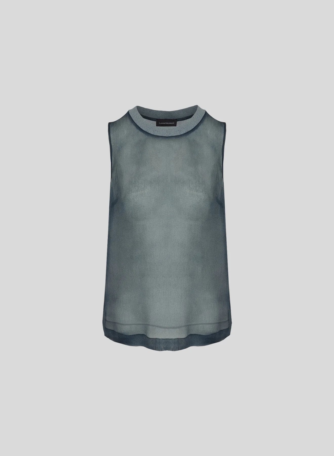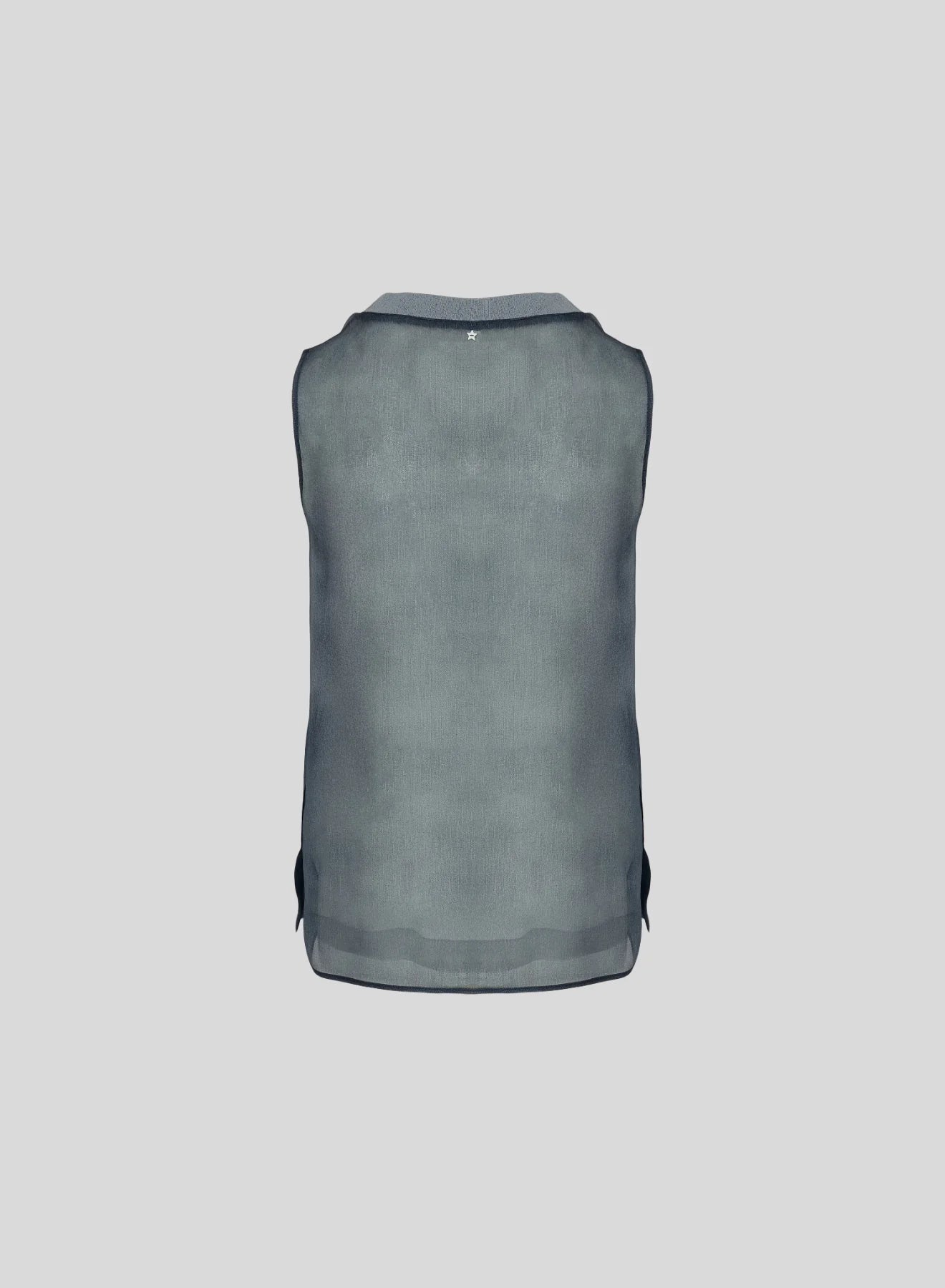 Crafted from exquisite sheer silk organza, this top is a refined and feminine accent for the most daring and sophisticated looks. The sleeveless design features a lurex knit collar and is distinguished by its texture and hue, which together create a sophisticated denim-effect appearance, making it a statement piece.