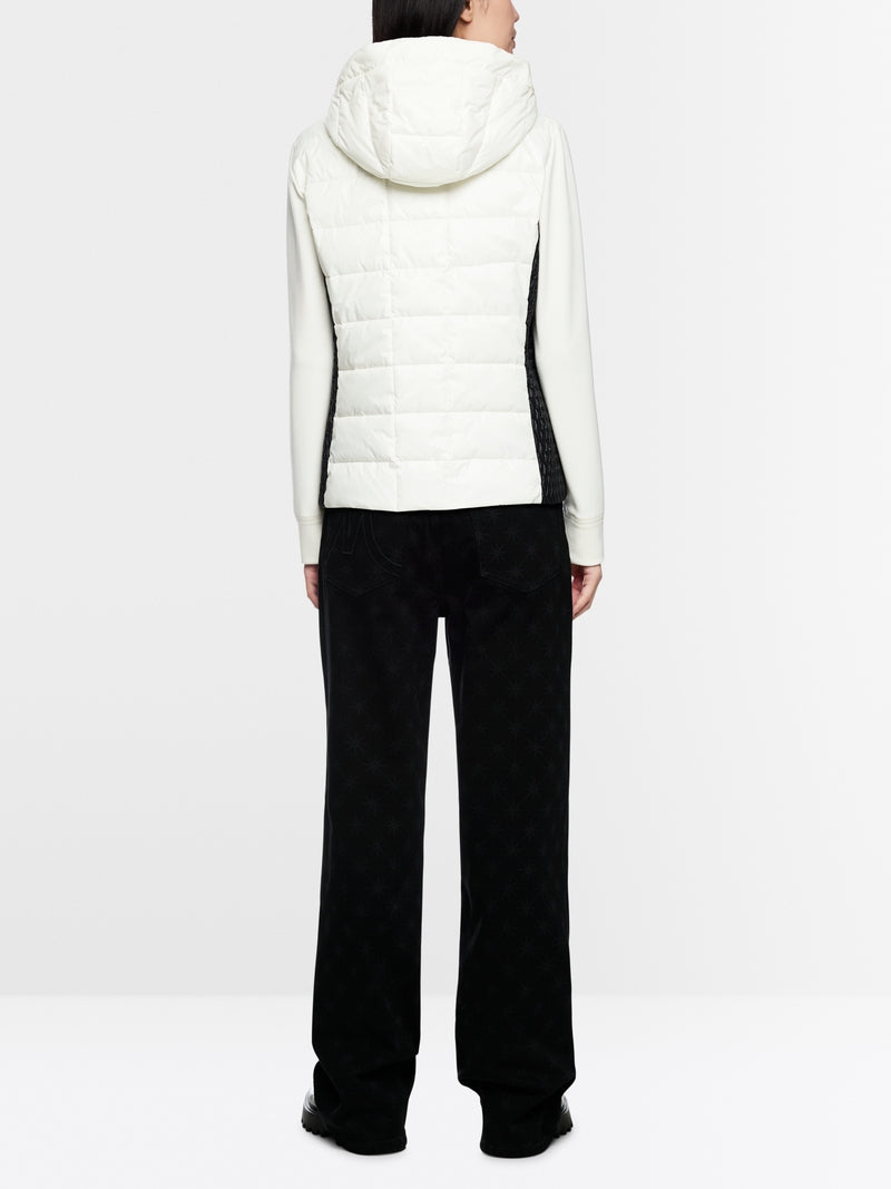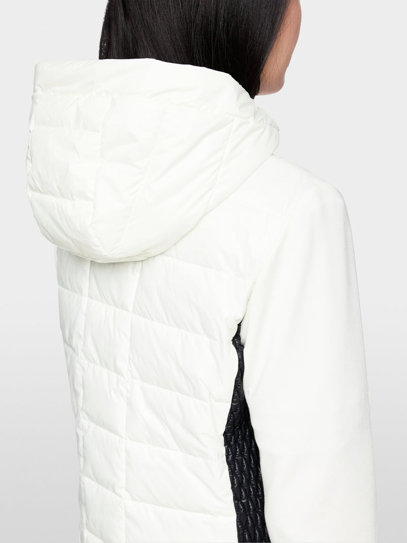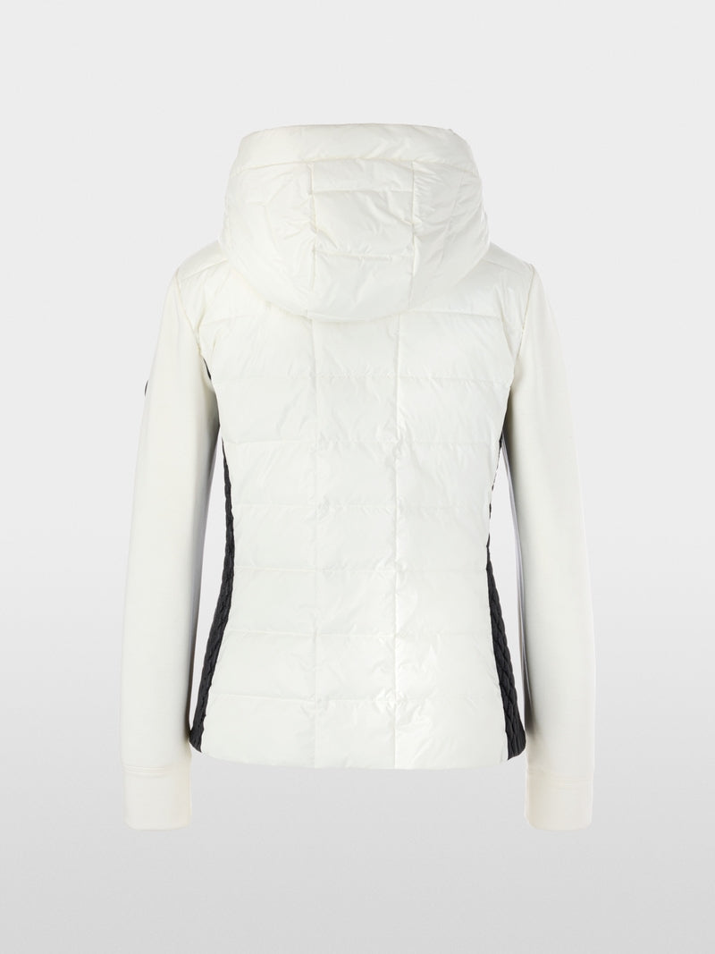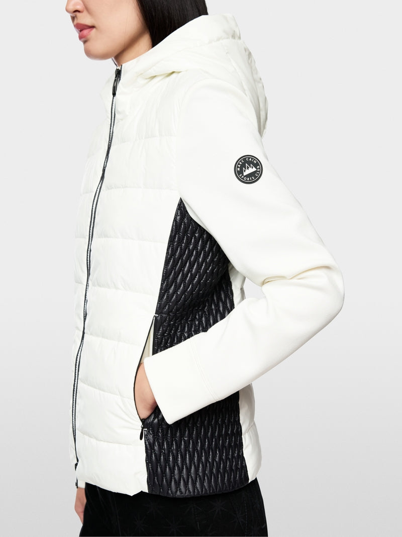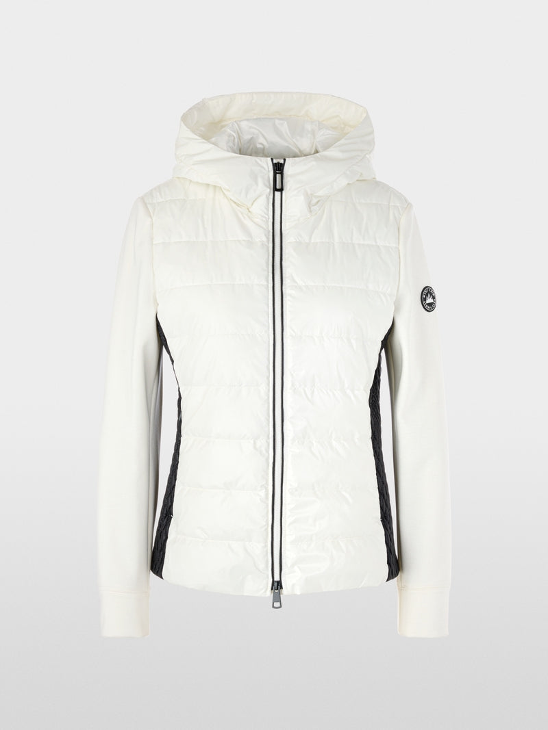 Sporty jacket with stand-up collar and attached hood. The front and back are lined with faux down for cozy warmth. The sleeves are made from a contrasting material while a colour-contrasting stretch insert at the sides ensures greater freedom of movement. This jacket fastens with a practical two-way zip. Ideal for functional layered looks.