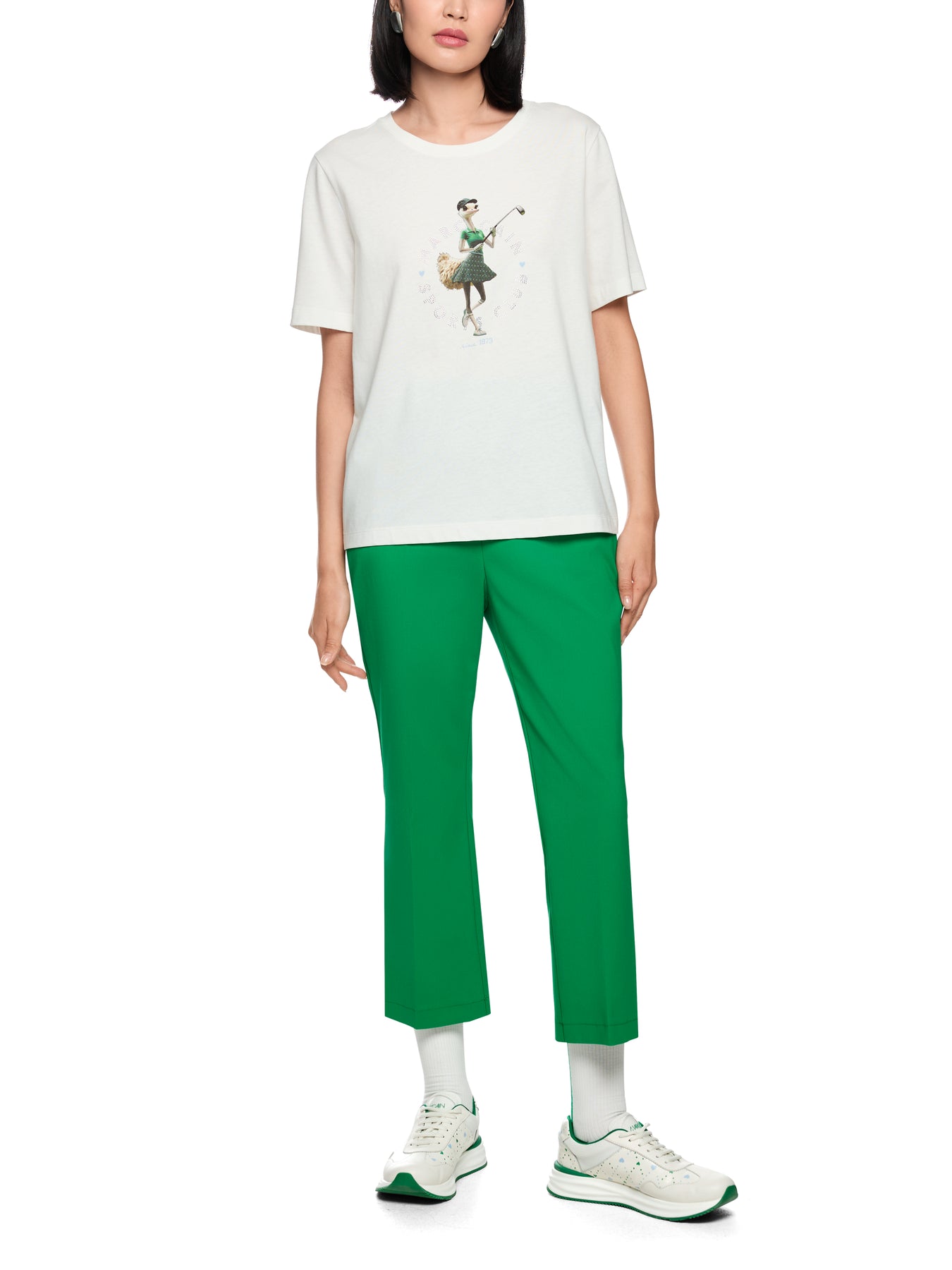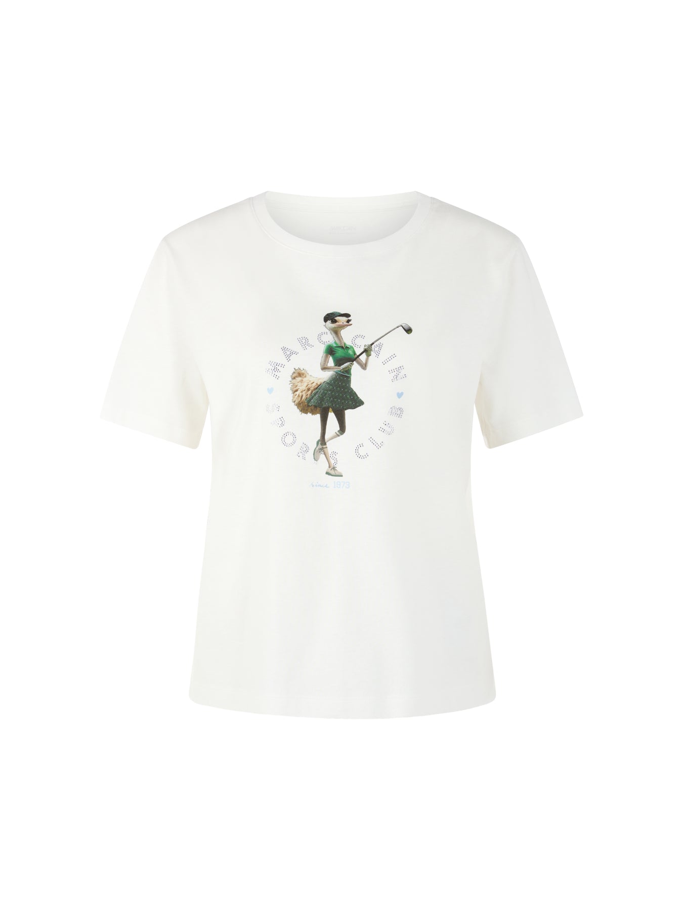 Loose-fitting round neck t-shirt by Marc Cain made from 100% organic cotton with short sleeves. The highlight is the humorous motif of an ostrich playing golf. The Marc Cain Sports Club print with small rhinestones adds a sparkling accent to the design.