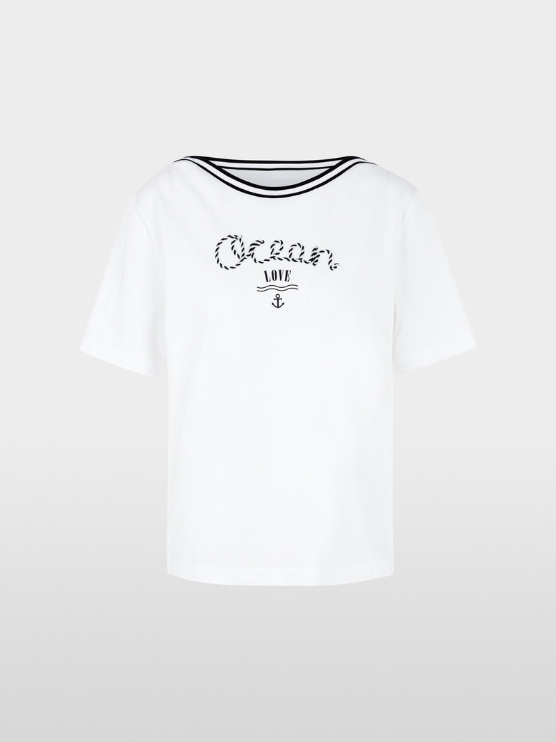 Loose fitting top by Marc Cain with a wide boat neckline, special lettering and short sleeves with cuffs that emphasize the maritime look of the shirt. The soft cotton blend is pleasant against the skin and offers a high level of comfort.