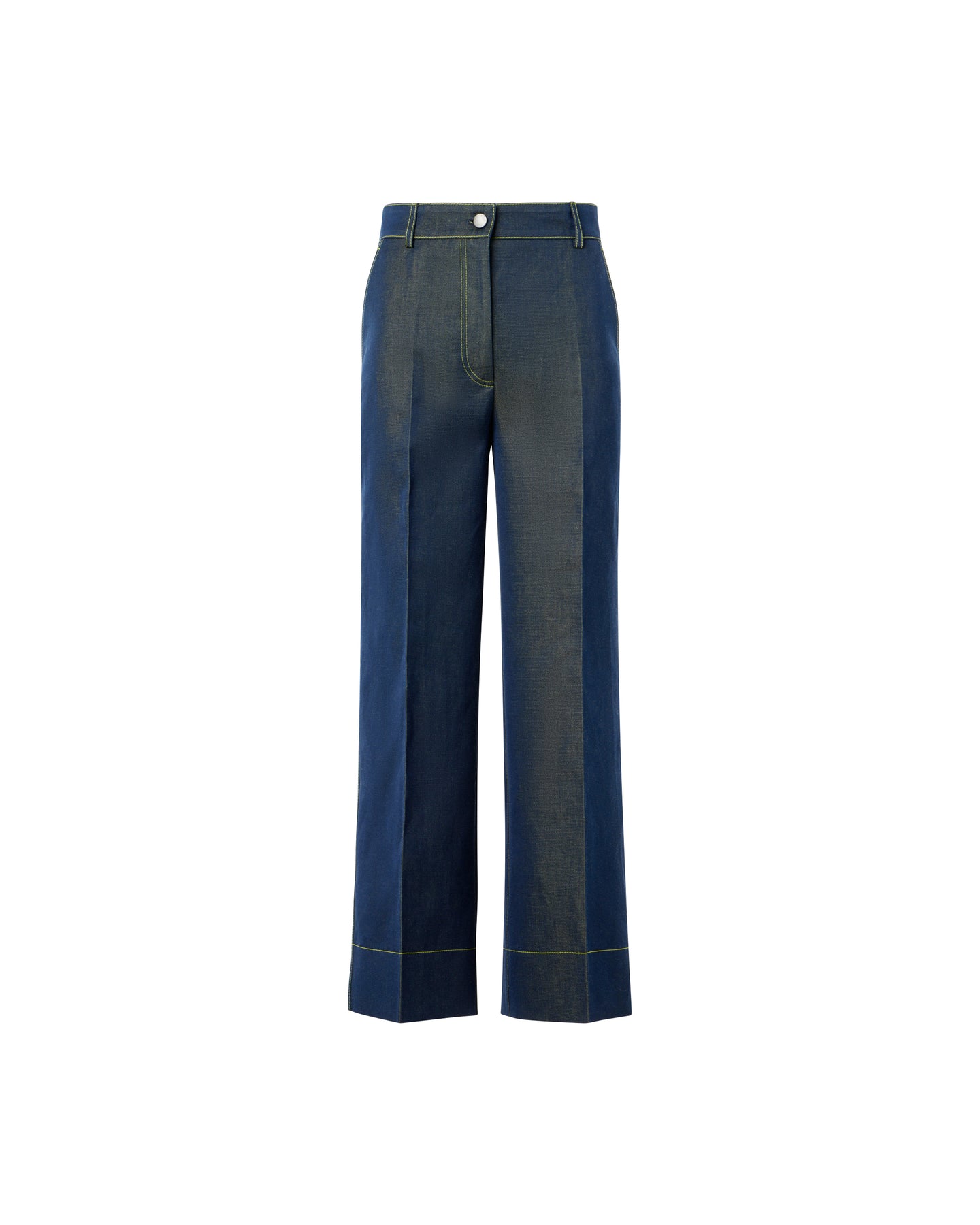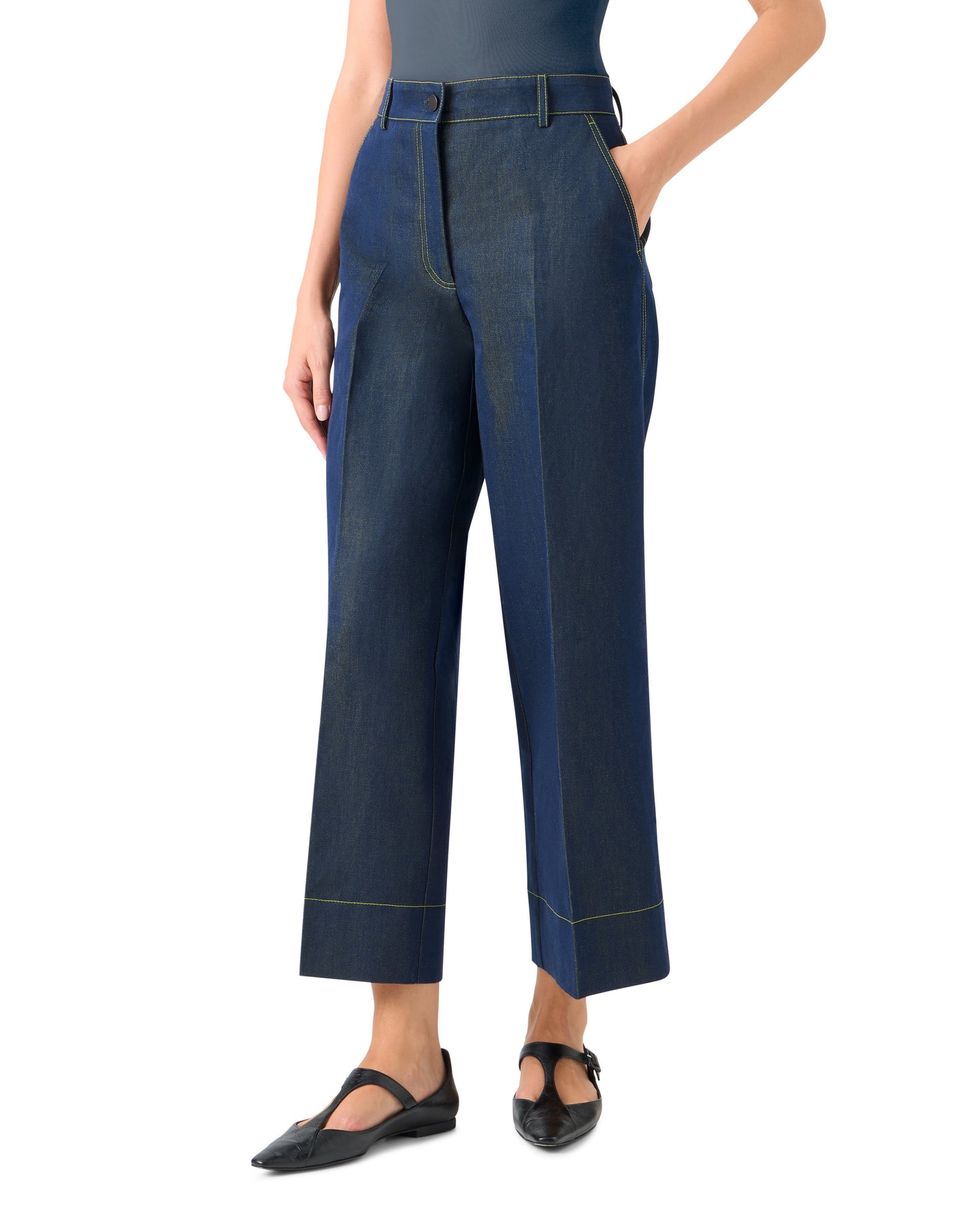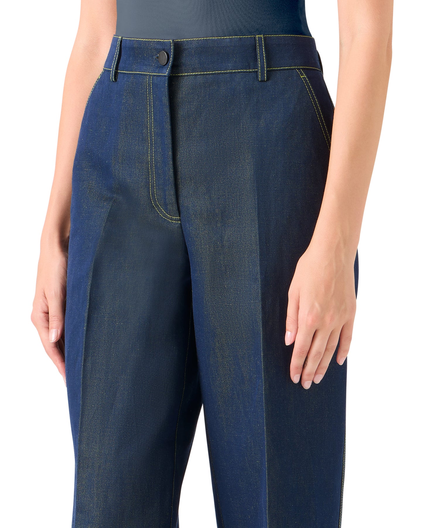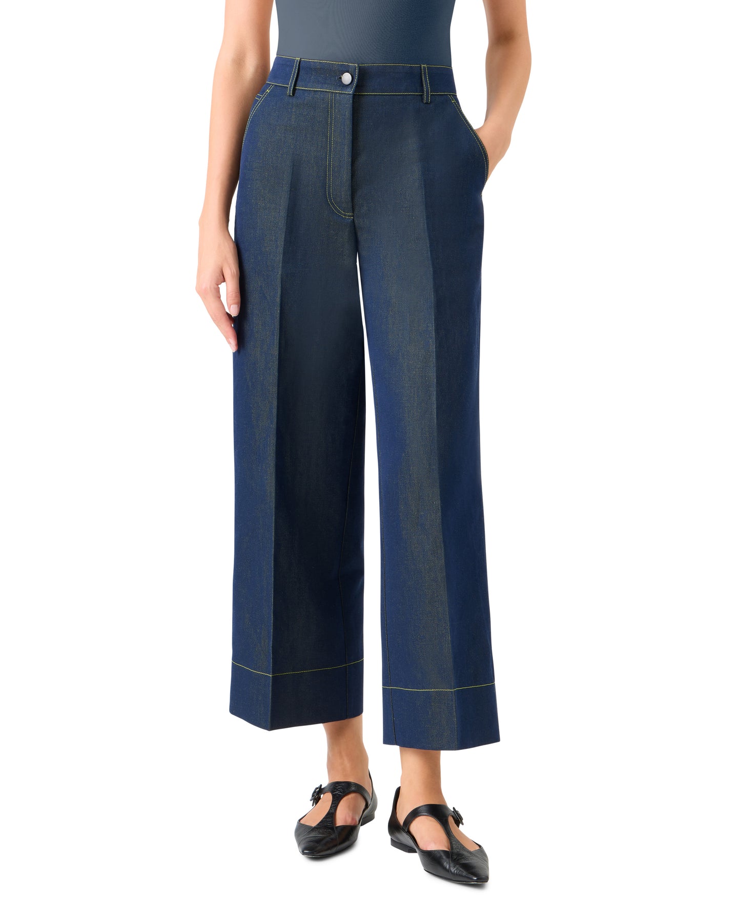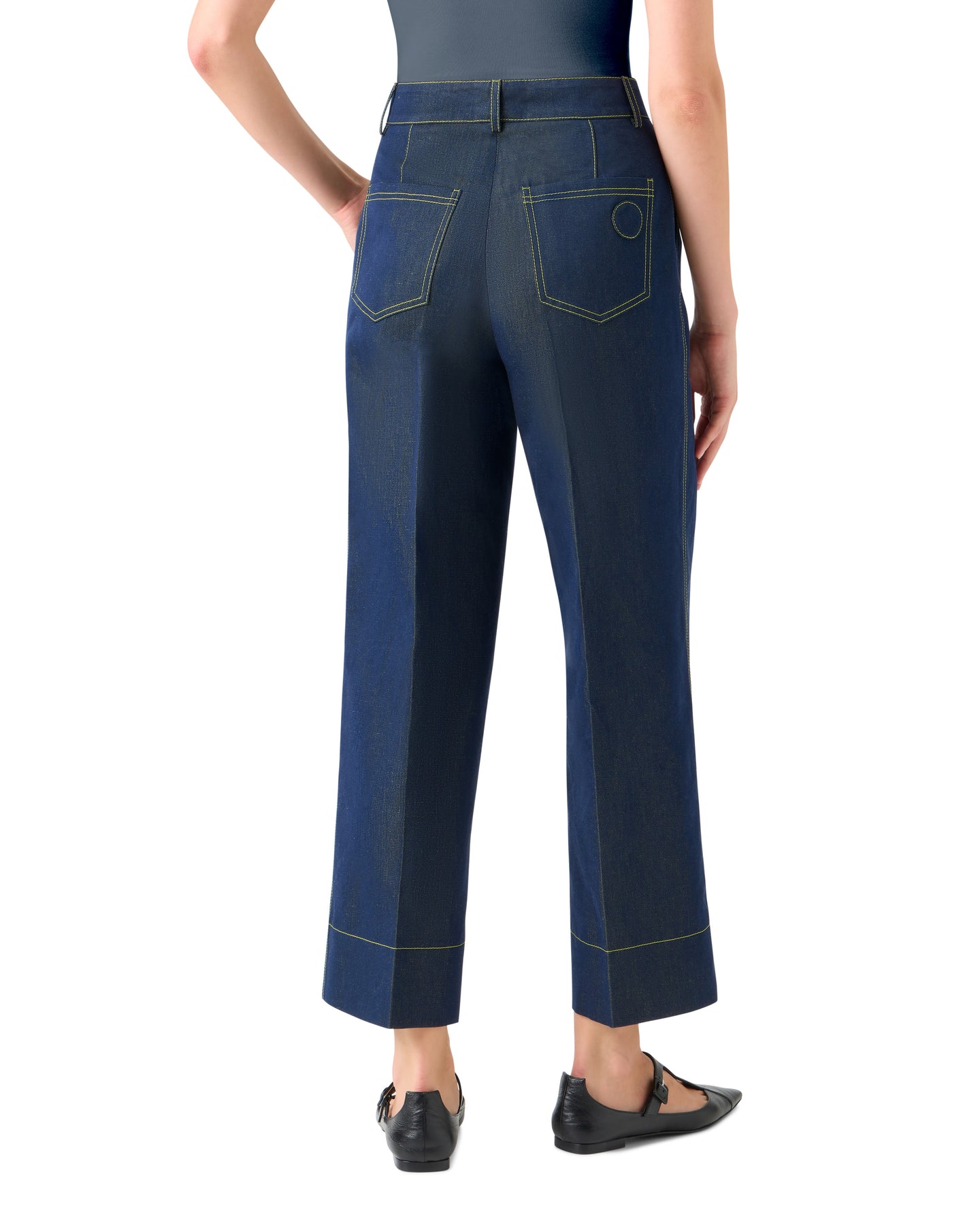 Denim "Chiara" pant by Akris Punto with an all over, lemon yellow, contrasting trim and a  3/4 length wide leg.