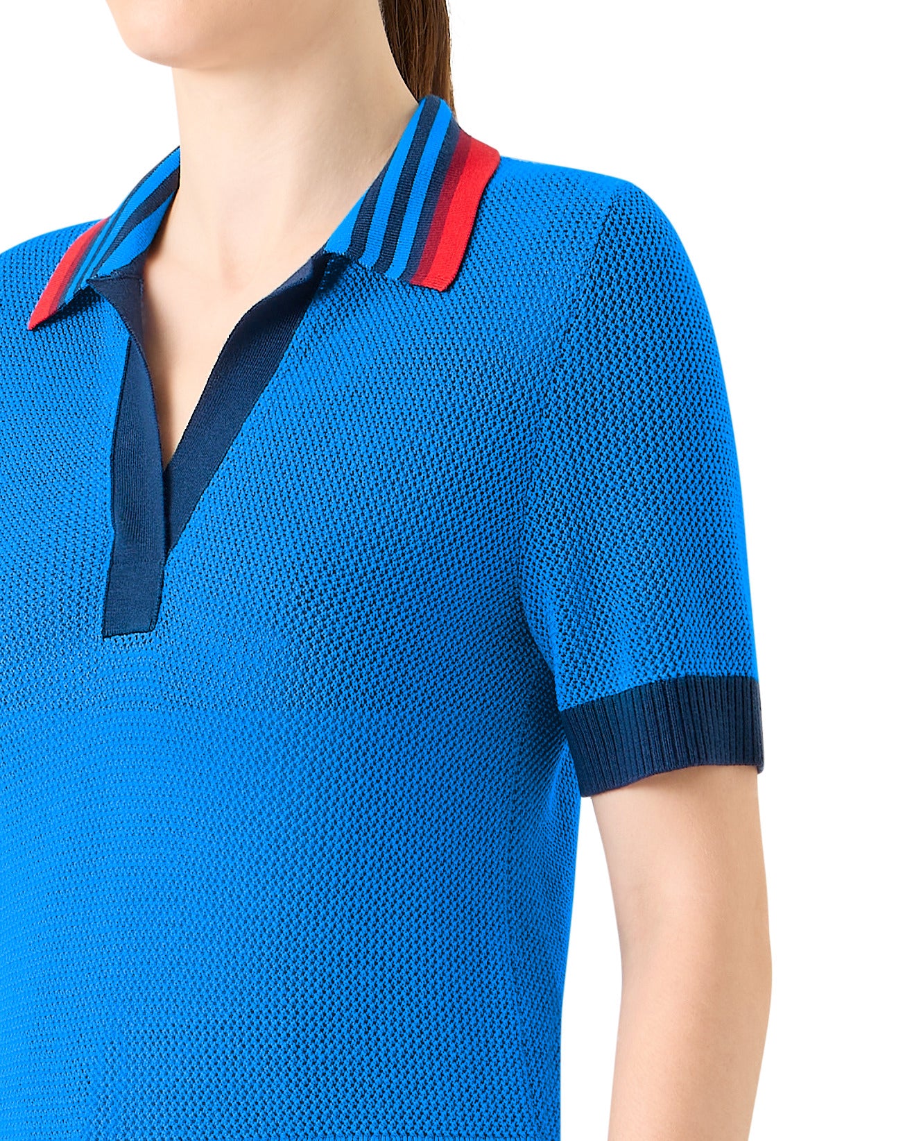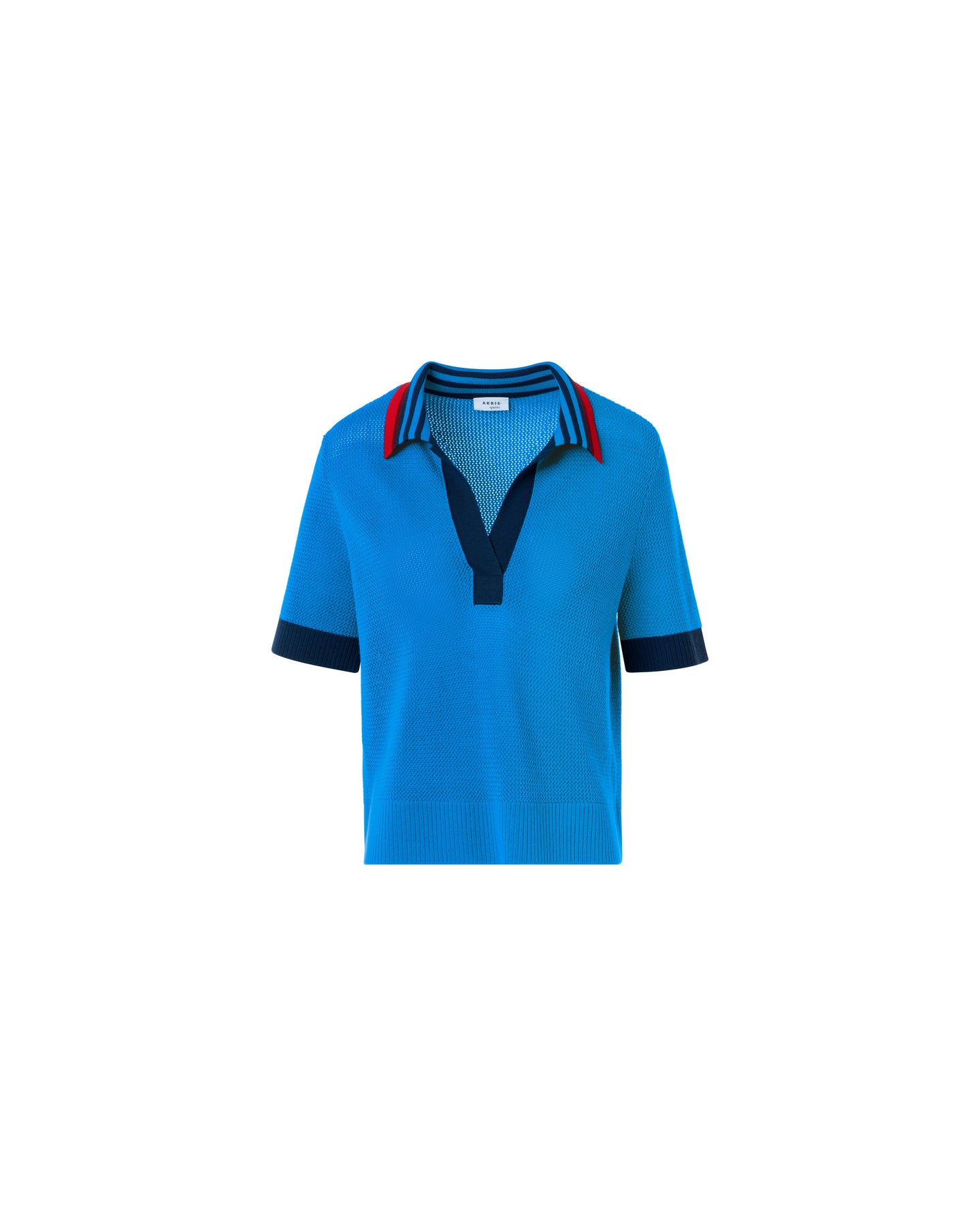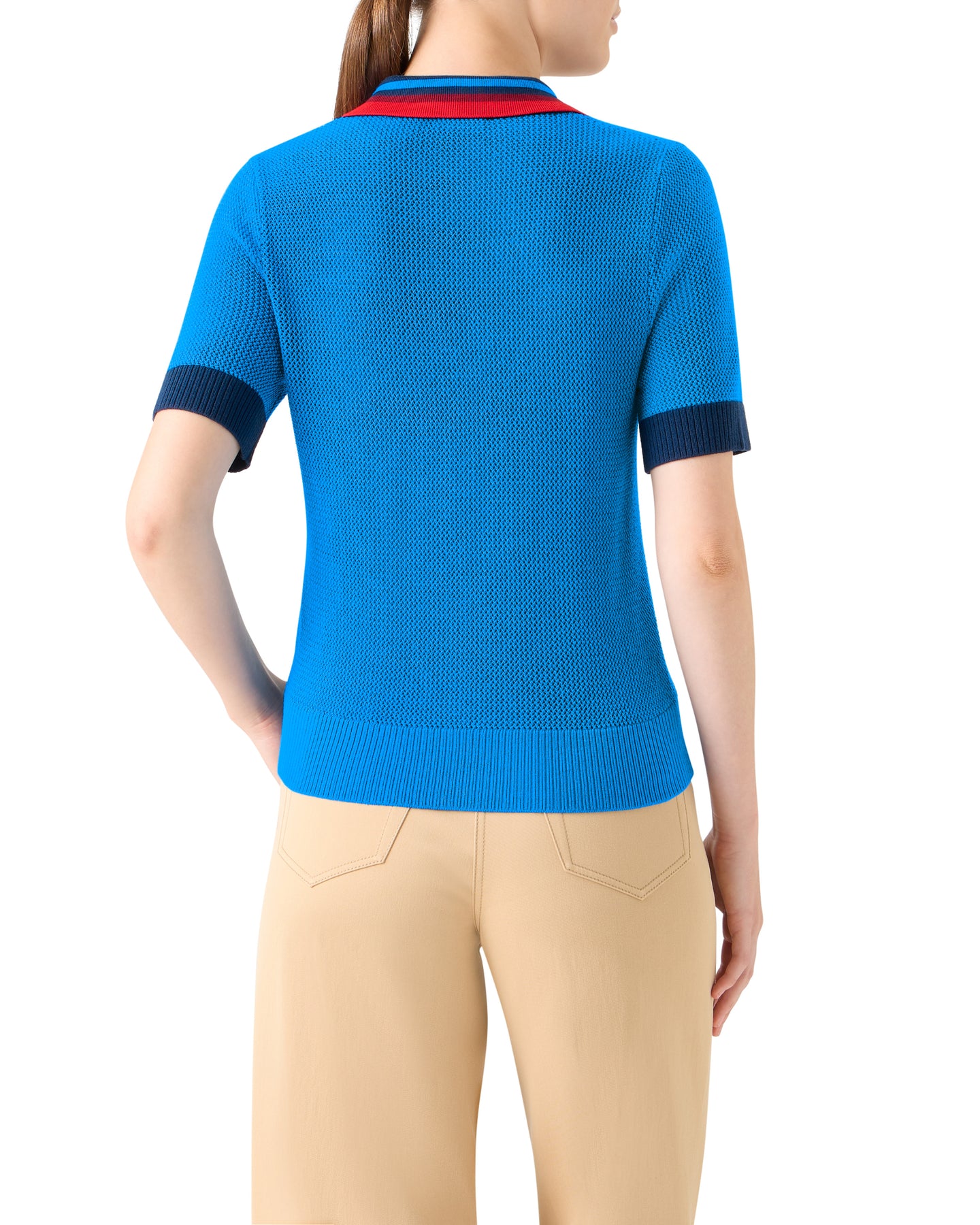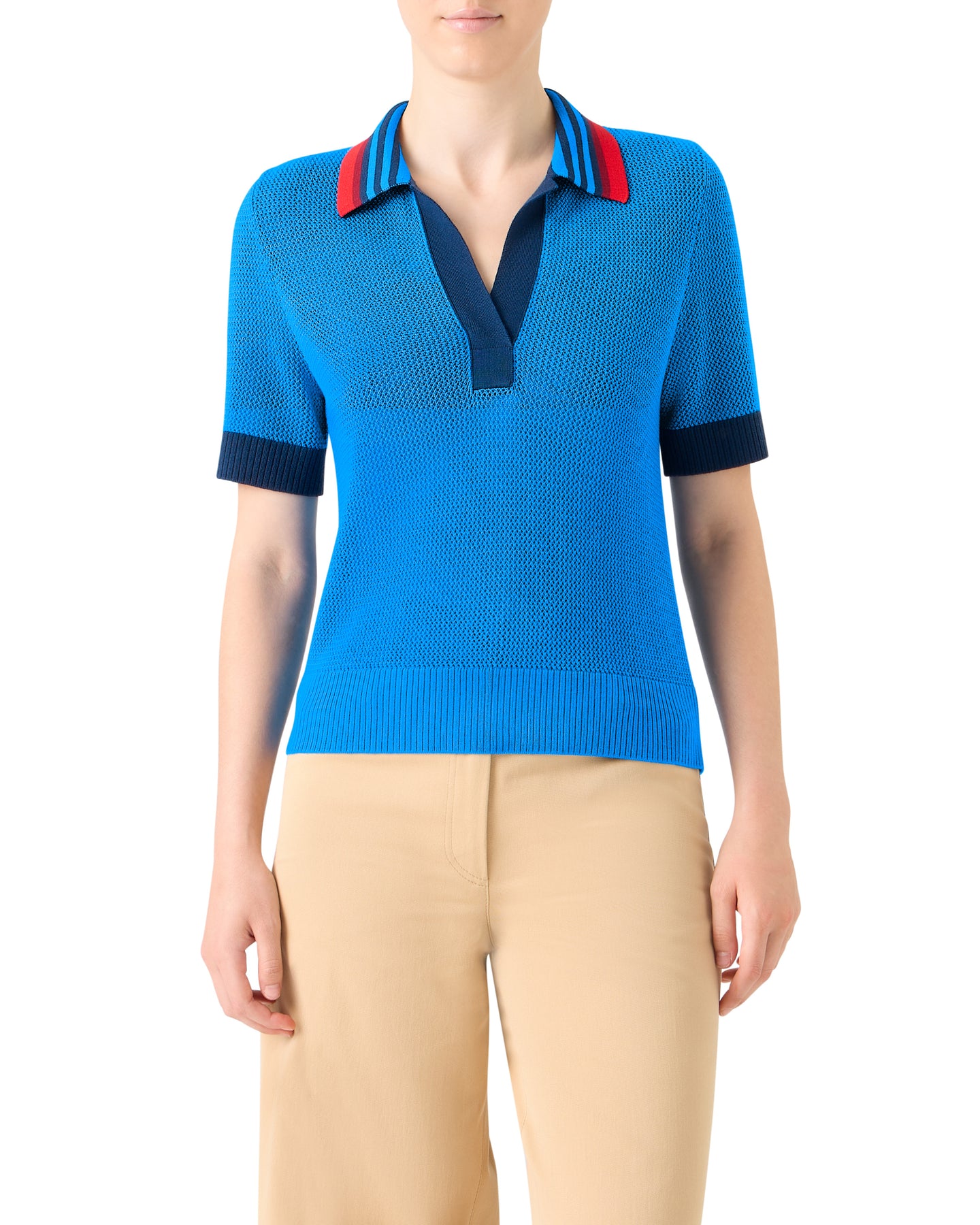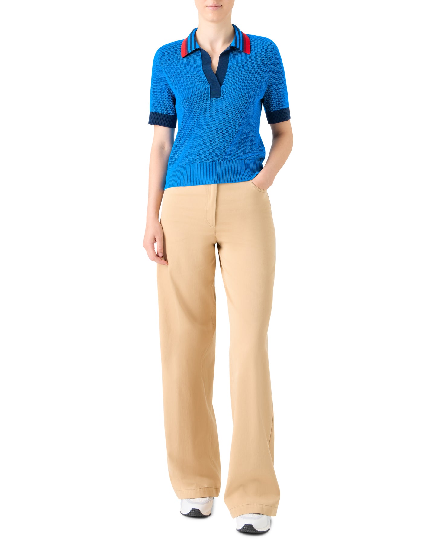 Polo style sweater by Akris Punto made from soft virgin wool.  The sweater has a deep v-neckline with contrasting colored trim.