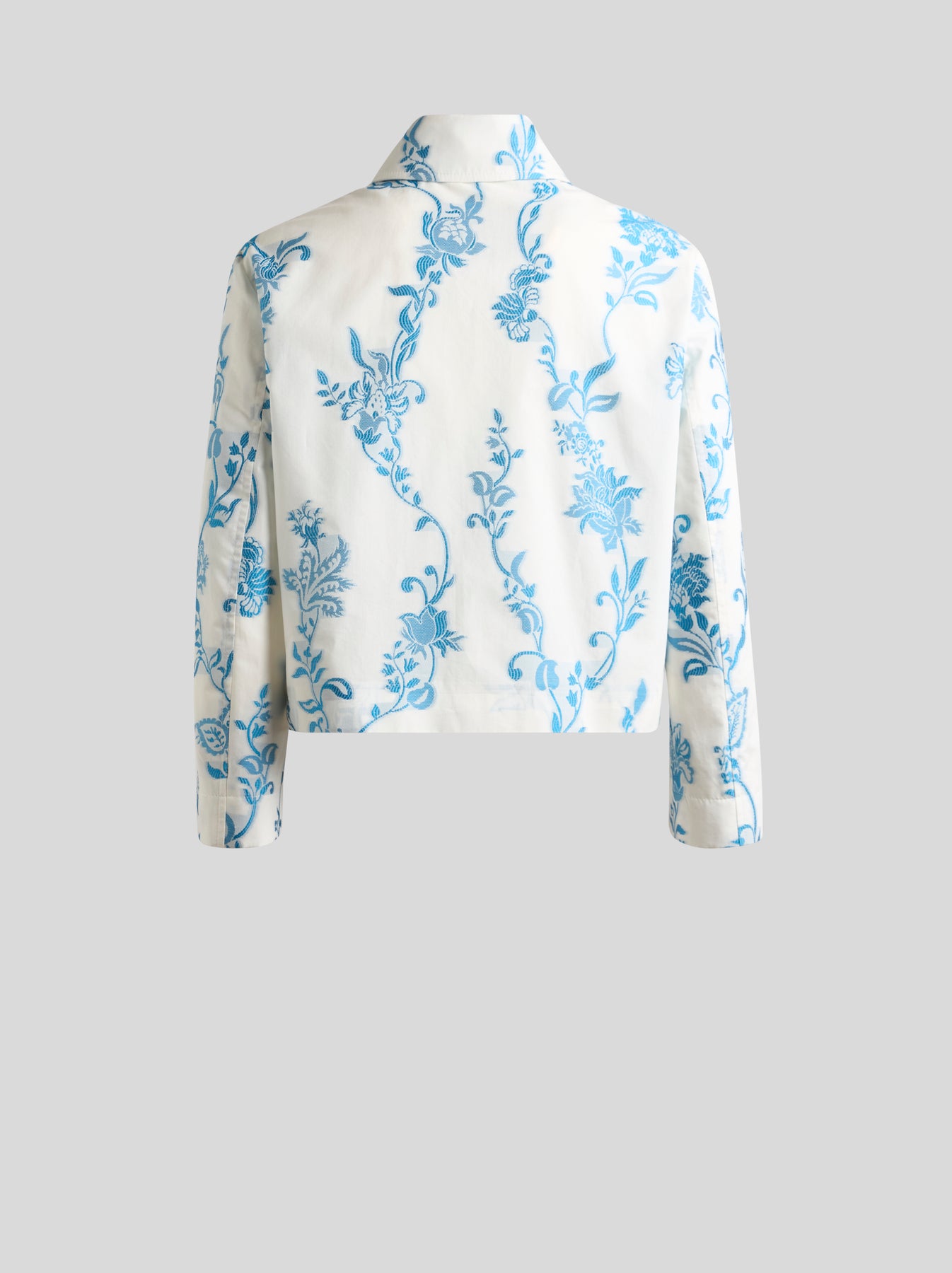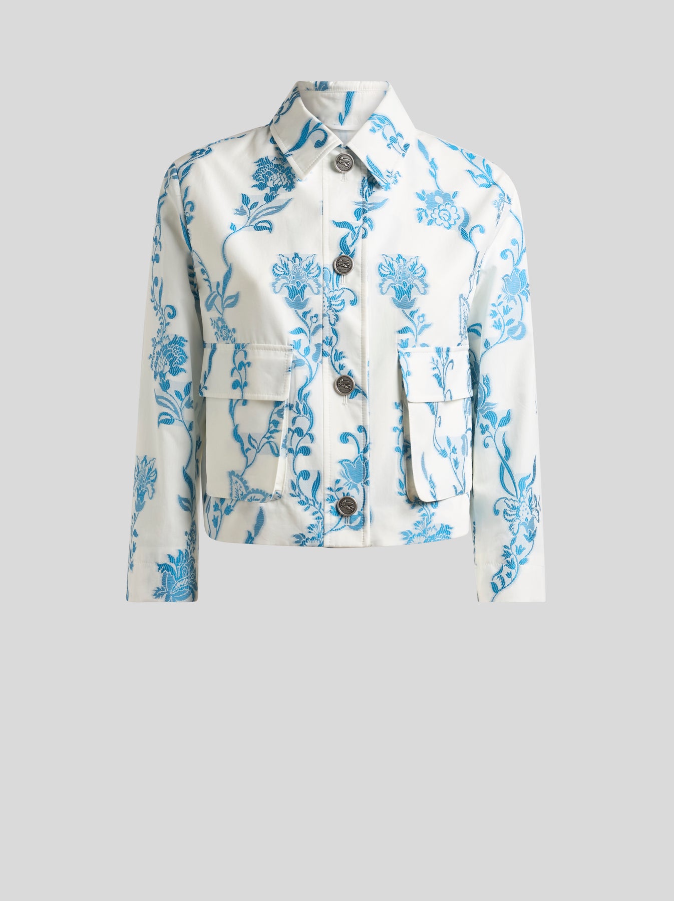 Jacket by ETRO with a delicate all-over floral print.  Details include a small collar, large front patch pockets and a front, logo pegaso, metal button close.