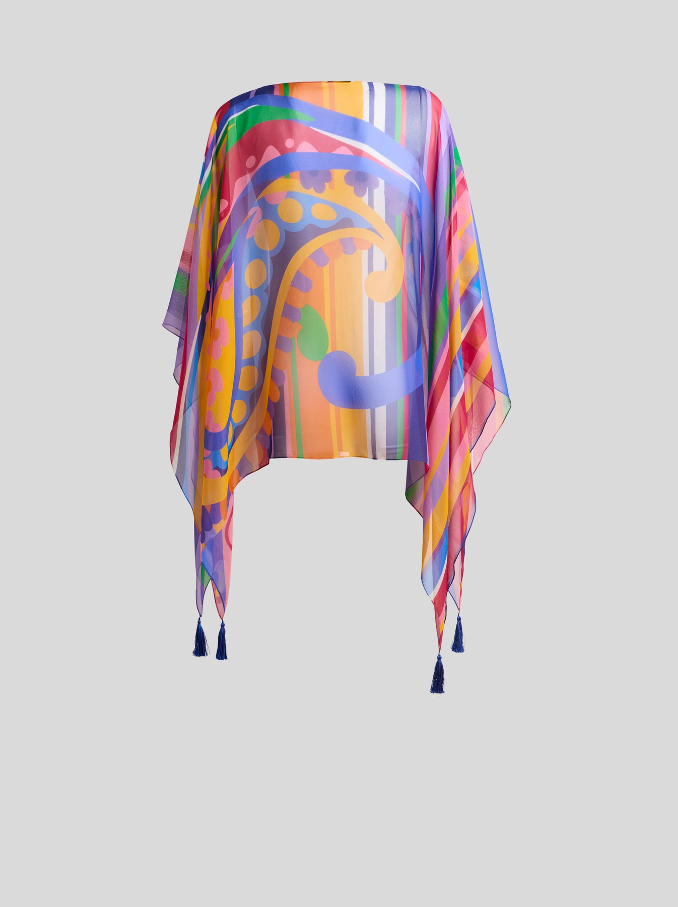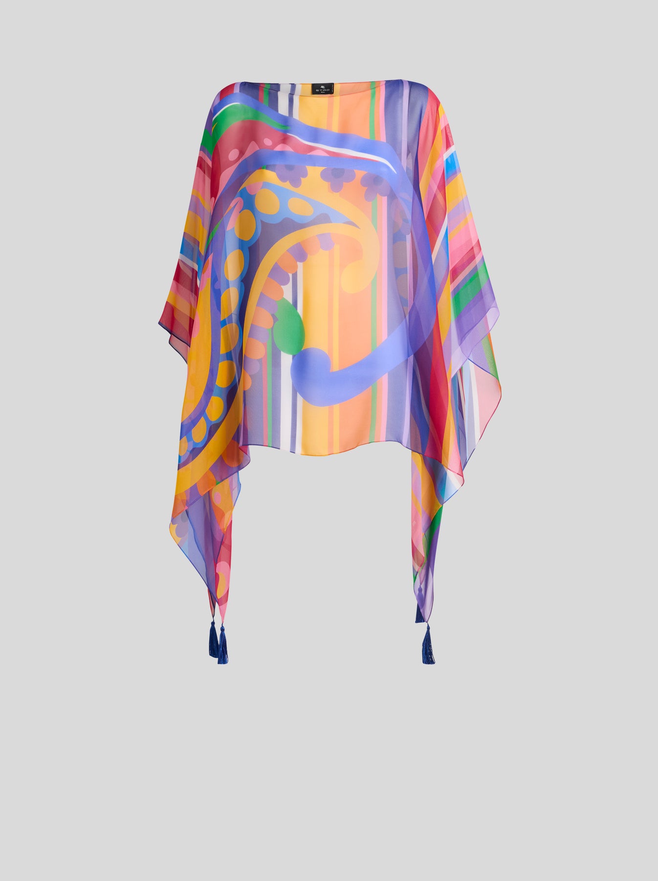 Flowing, silk poncho style top by ETRO with a wide boat neckline and a tassel finish on the hemline.
