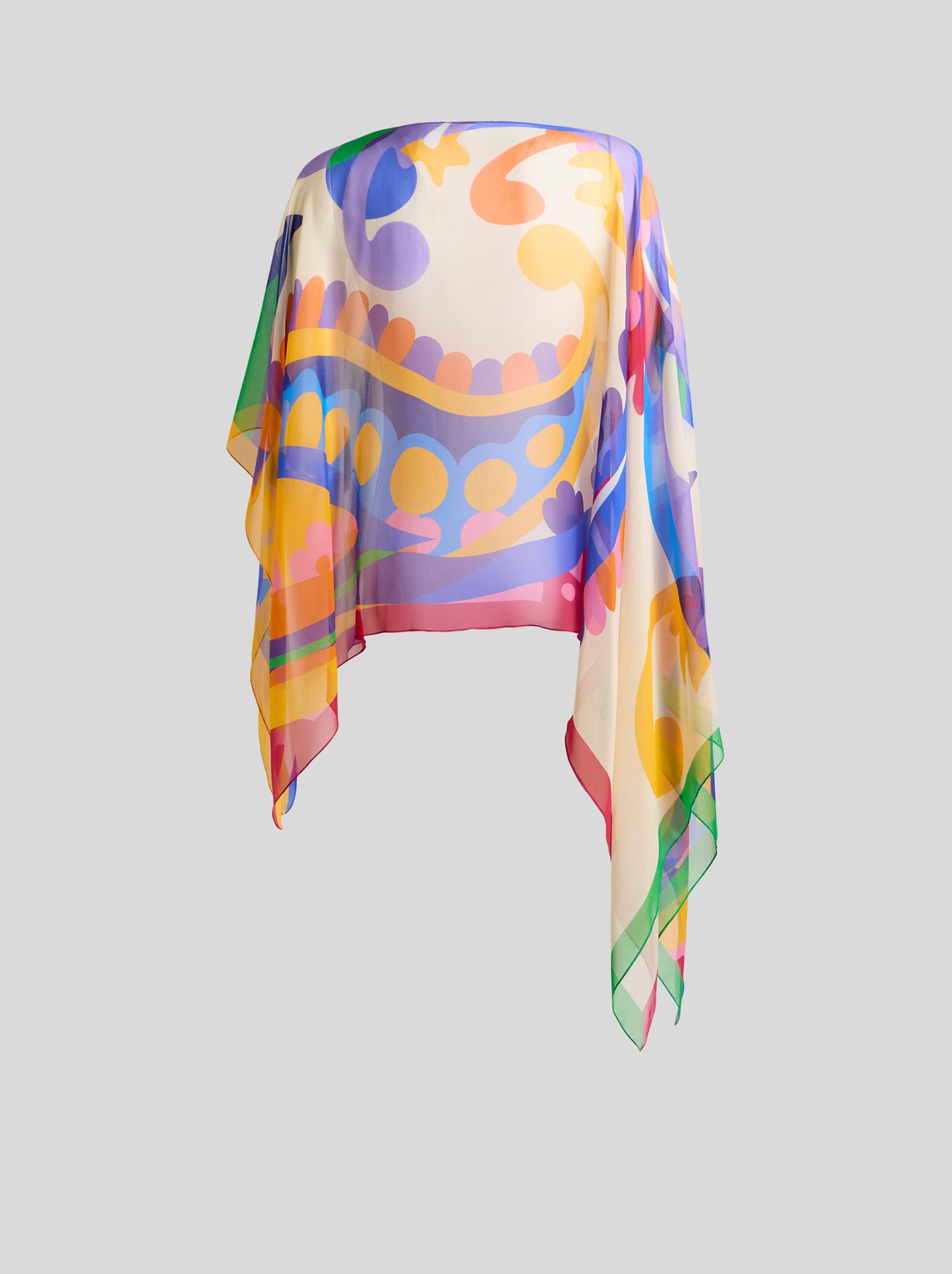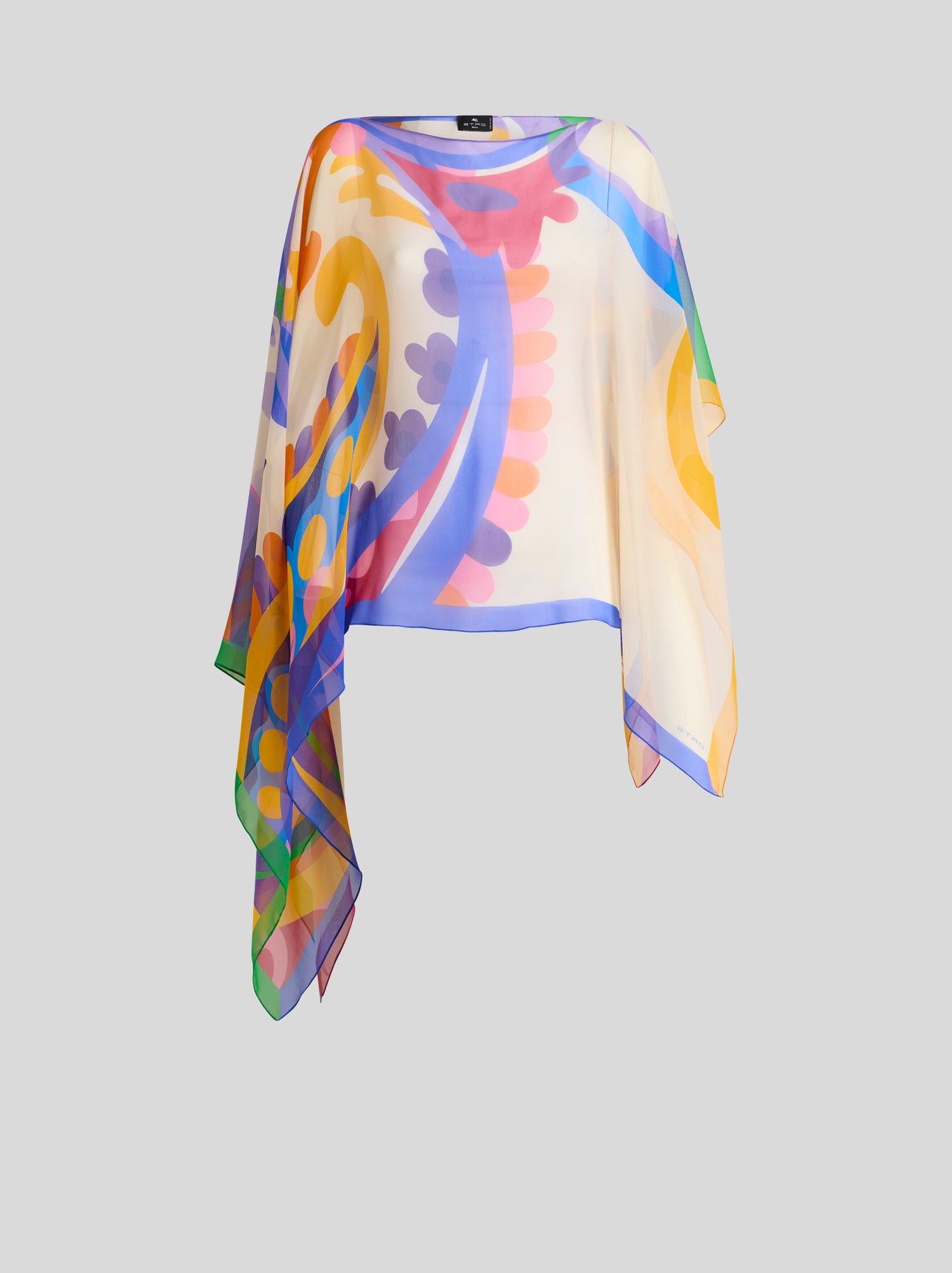 Flowing, silk poncho style top by ETRO with a wide boat neckline and an asymmetrical hemline.