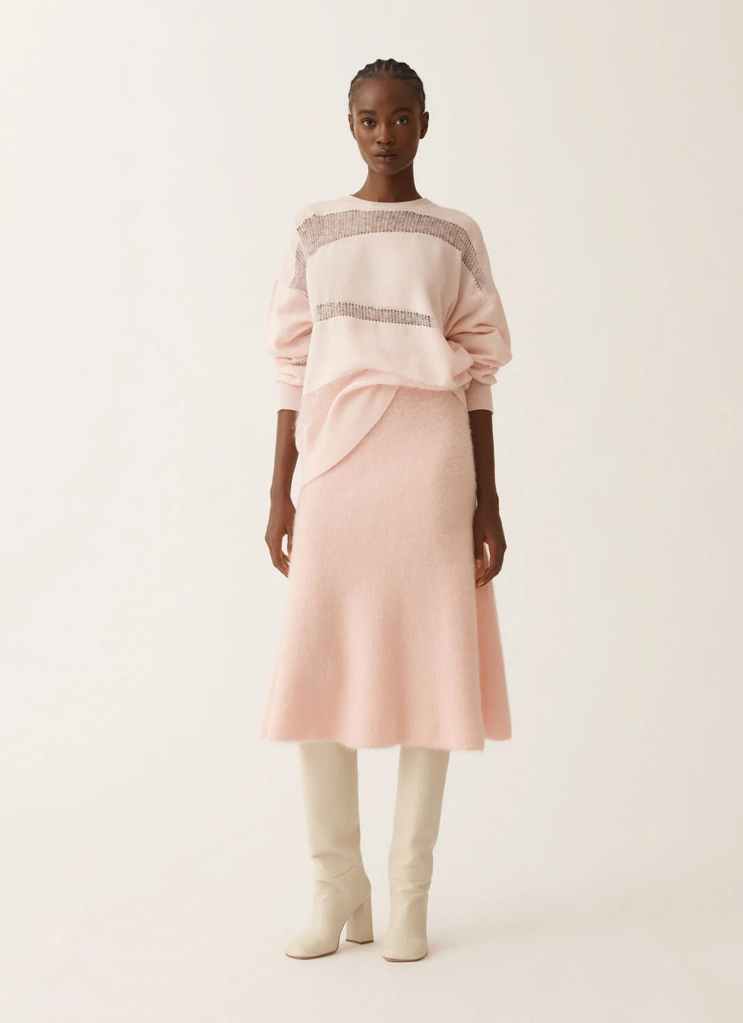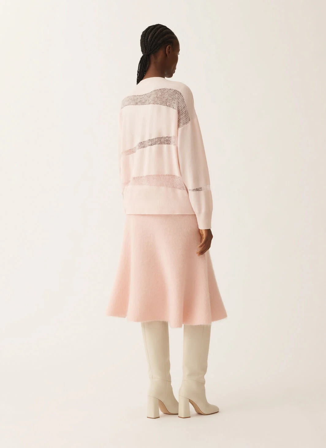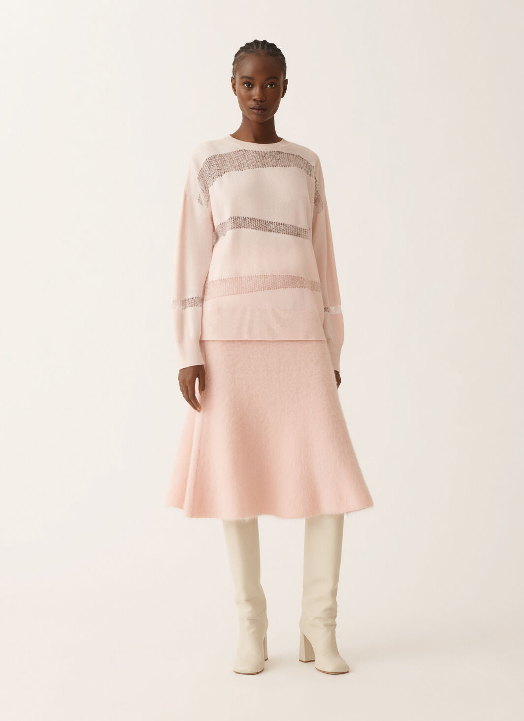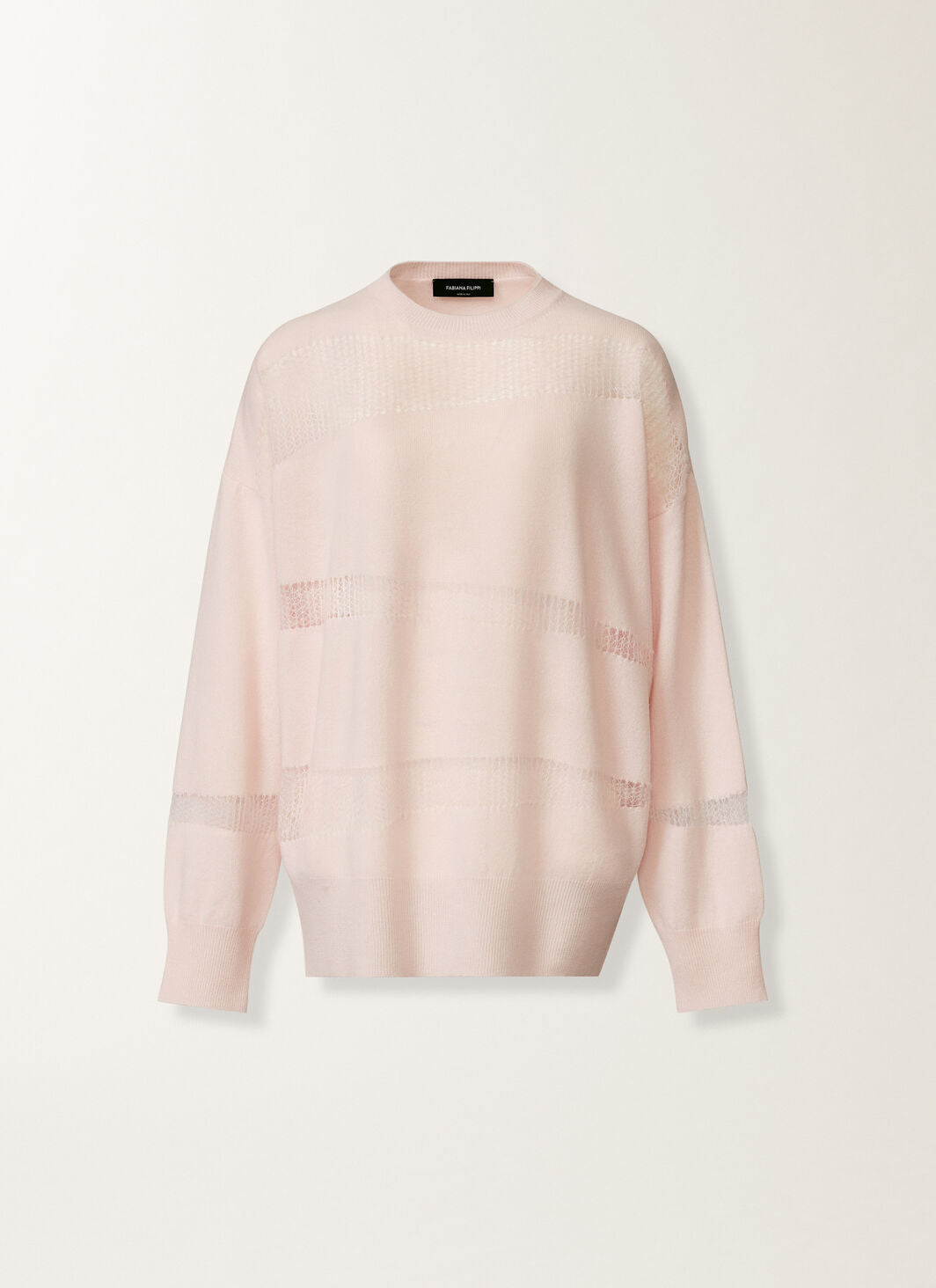 Luxurious sweater by Fabiana Filippi that combines wool, cashmere, and silk, this oversized round neck sweater exudes contemporary elegance, highlighted by mohair net inserts.